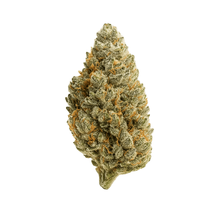| Uiterlijk | Lange, dichte toppen met oranje stampers en dikke trichomenlaag |